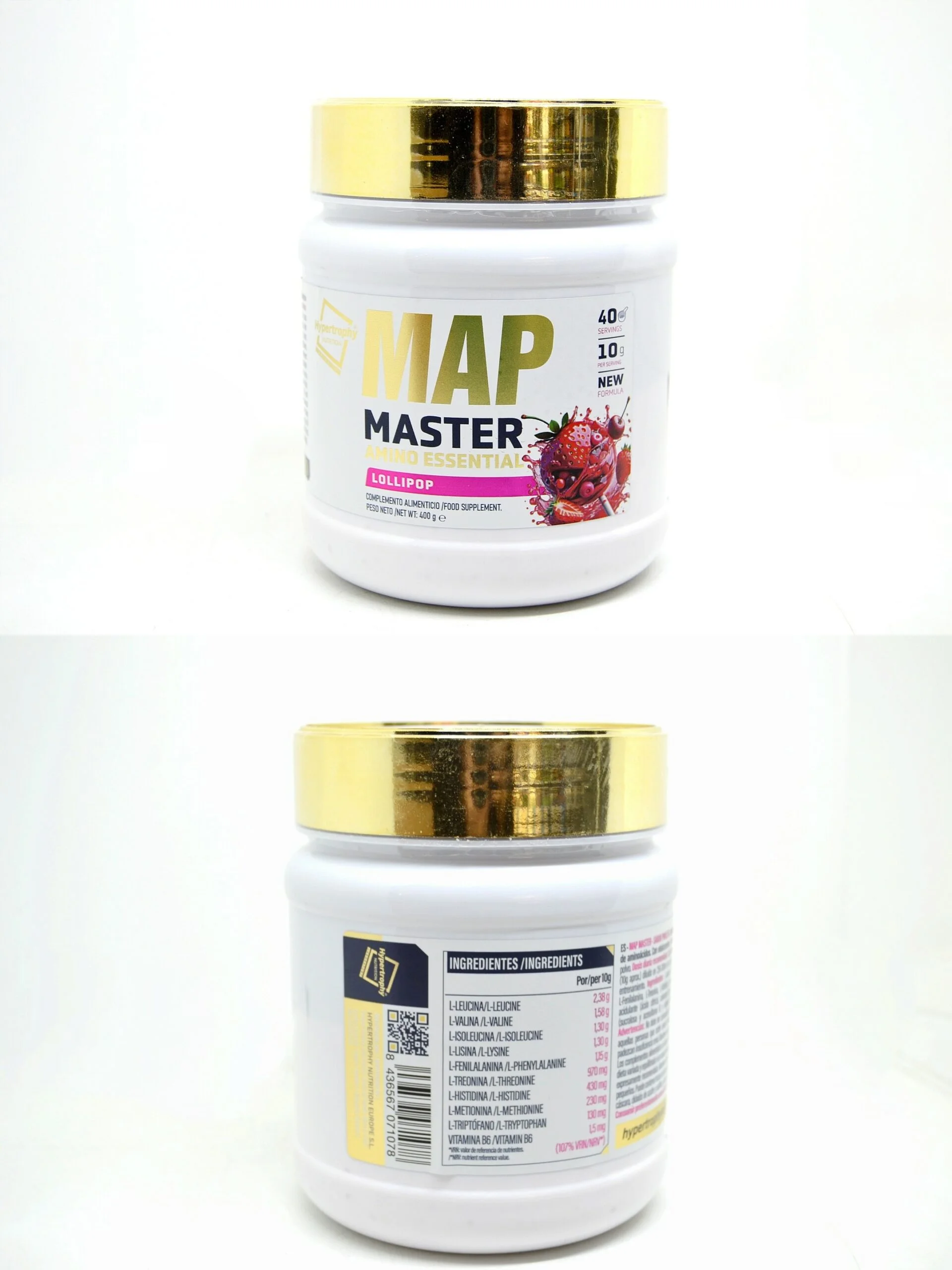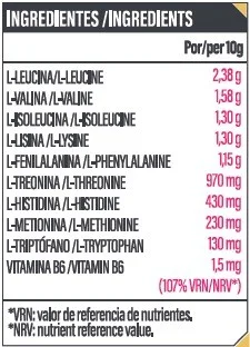 Además de los aminoácidos, la fórmula contiene vitamina B6, que ayuda en el metabolismo de proteínas y aminoácidos. El suplemento está aromatizado y edulcorado con sucralosa y acesulfamo K, e incluye ácido cítrico como acidulante y colorante de remolacha para darle sabor y color.