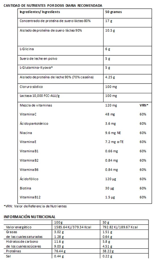 Concentrado de proteína de suero de LECHE 80% proteína (emulgente (lecitina de SOJA)), Aislado de proteína de suero de LECHE 90% proteína (emulgente (lecitina de SOJA)), L-Glicina, Suero de LECHE en polvo, L-Glutamina-Kyowa®, Aislado de proteína de LECHE 90% proteína (70% caseína), Aroma, Edulcorante (Aspartamo), Mix de vitaminas (Vitamina C (ácido L-ascórbico), maltodextrina, vitamina E (acetato de DL-alfa tocoferilo), niacina (nicotinamida), ácido pantoténico (D-pantotenato cálcico), vitamina B6 (clorhidrato de piridoxina), vitamina B2 (riboflavina), vitamina B1 (clorhidrato de tiamina), vitamina B12 (Cianocobalamina), folato (ácido pteroilmonoglutámico) y biotina (D-biotina)), Cloruro de sodio, Lactasa 10,000 FCC-ALU /g, Edulcorantes (Sucralosa, Acesulfamo K), Aromas.